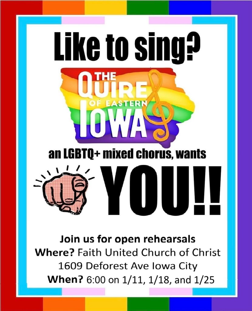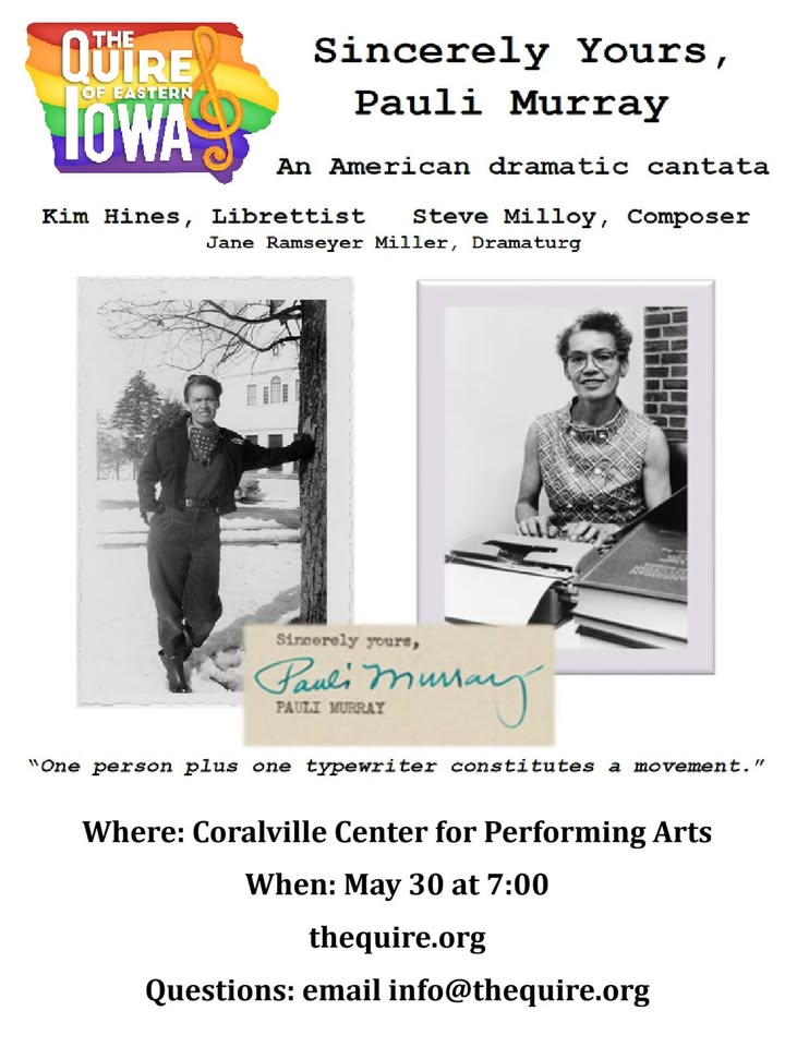 Do You love to sing? And are you a part of the LGBTQ+ community or an ally? Join us for our open rehearsals at Faith United Church of Christ (1609 Deforest Ave, Iowa City, IA 52240) as we begin an exciting season full of music and community. This semester, we will be performing Sincerely Yours, Pauli Murray, a multi-movement dramatic work that tells the story of an American civil rights activist, lawyer, poet, and the first Black person perceived as female to be ordained as an Episcopal priest.