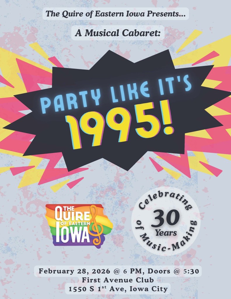 Come celebrate 30 years of music, community, and all around queer joy! The Quire is performing our 30th Anniversary concert twice this season. Come out and join us on December 13th at the Ballantyne Auditorium in Cedar Rapids, and December 19th at the Coralville Center for Performing Arts. Doors will open at 6:30, and the music starts at 7:00. We can’t wait to see you there!