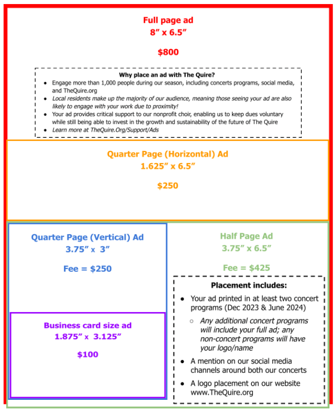 - Your ad provides critical support to our nonprofit choir, enabling us to keep dues voluntary while still being able to invest in the growth and sustainability of the future of The Quire